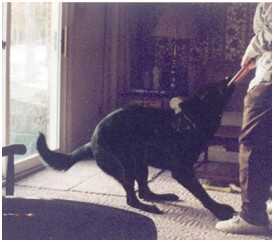 July 28, 1998 Age: 4 Weight: 115 lbs. Sex: male Significance of name: My dad, Francis, who died in 2001, named him. IQ: 130. He understands everything, but I can't explain to him what a thunderstorm is. Sometimes he's as dumb as a post and at other times he's so smart it's scary. One year just before Christmas, I was wrapping presents and Bear brought over something from his toy box -- a Christmas tree squeak toy! I think it was more than a coincidence because he seldom played with that toy. He loves Christmas. He unwraps his own gifts. When Dad was alive, I was sorting some stuff in one room and Dad was in another room. I put a few small items in a slipper and I asked Bear to bring it to Dad. Bear did it without hesitation. Temperament/personality: He's ordinarily a sweet, lovable teddy bear. When there's thunder, I call him my "armpit bull" -- he sticks his head under my arm and suddenly I find I have a 115-pound lap dog. He has an assortment of barks. There's the I-mean-business bark, reserved for strangers; the friendly bark (with a little howl at the end) for people he knows; and, of course, there's the throw-that-ball-already-would-ya bark. Favorite toy/game: He's no couch potato. He wants to play from the minute I get up until I leave for work; and when I come home, he greets me at the door with a toy in his mouth. He will also coerce anyone into playing "tug" with him (see photo) at every opportunity. After I throw a ball and he catches it, he does a "victory lap": He runs into the dining room, goes once around the dining room table, comes back into the den (where I'm sitting), then runs through the kitchen, through the hall foyer, through the living room, and then into the dining room and back to the den. Favorite thing to chew: large rubber bone. He doesn't chew up things he's not supposed to -- except for the car. If a stranger approaches the car (while he's inside it), he gets VERY aggressive and starts biting the upholstery or anything he can get his teeth into. But he never chews anything in the house. Antics: He likes to "steal" socks and slippers -- he moves them around the house. He's very proud of himself as he does this -- he will prance about, looking like he's thinking "nyah-nyah-I've-got-this-and-you-don't." Outside, he likes to run in circles around one particular tree -- he's created a trench a foot deep. Perhaps it has to do with a herding instinct. Favorite people food: ice cream, liverwurst Bear's favorite person (other than Sue): her sister, Therese If Bear could talk, he'd say: "We gonna play now?" TV preferences: Animal Planet, especially America's Funniest Animals. If he sees a dog he doesn't like, he'll bark at the TV. He's not too big on people programs. Strong likes/dislikes: He loves water and will stay in my sister's pool indefinitely. I took him to the beach in May and the water was really cold. He followed me in -- 100 yards out -- and swam with me. He hates horses and barks at them. I have to be sure to keep him on a lead if I notice hoof prints while we're out walking. On a scale of 1 to 10, how obedient is he?: 9+. He was trained by my friend Donna, who is a dog trainer. I can take him to work and he'll stay in my office (with the door open) without wandering off. He comes when I call him, he gives me his paw when I ask for it, and he will "speak" on command. Feeding the deer: We have deer on the property (see photo) and I put out food and water for them every day (we're very aware of ticks here and I do what I can to protect us). Bear loves to accompany me when I feed them. The deer will be only 5 to 6 feet away and Bear doesn't chase them or bark. And he goes through the same ritual each day: he runs two circles around the woodshed, two circles around a pine tree, and two circles around a tree to the right. And he times it perfectly, so that he runs directly in front of me as I'm coming out the door with the stuff for the deer. After that's done, we come back inside, and Bear will bring me his food dish -- from wherever he happened to leave it. If he forgets, I'll say, "Where's your dish?" and he will retrieve it. Least appreciated thing Bear does: When I let him out into the yard, he'll stare at my neighbor's dog -- a female white Lab -- instead of doing his business. Comment: Bear will always protect me -- except from a thunderstorm. |