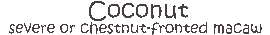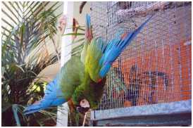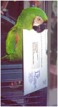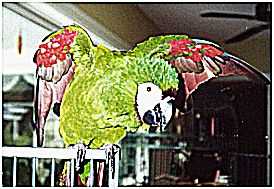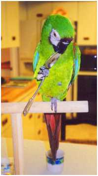 15 Sex: not sure, but we've noticed lately that "he" might be doing some nest-building under our sofa cushions. Weight: 1 lb. He's a bit pudgy and should be 12-14 oz. Length: 19 in. Eye color: black with yellow iris Scientific name: ara severa Residence: Davie, Florida IQ: 120 Favorite toy: wooden clothes pin; anything he can tear apart, like wine corks. Favorite people food: pasta (al dente, of course); pistachio nuts. Favorite thing to chew: his toys, my finger (Patti) Best trick: He shows his wings off on request and sometimes we don't even have to ask. He says "good night" when I put him to bed or he will say it to let me know he's tired and wants to go to sleep. Cutest thing Coconut does: He tells himself "Stop That" when he's making a lot of noise or arguing with Bamboo (our other macaw). The least appreciated thing he does: He's messy -- he flings stuff across the room and there are feathers all over the place. There are days when he's neat, but occasionally I come home from work and I'm horrified and I say "did you guys have a big party here today?" On a scale of 1 to 10, how human is Coconut: 12 Favorite person other than family: Getting a bird to like more than ONE person can be difficult. The most endearing thing Coconut does: When he wants to wake up Richie (who is three rooms away), he'll call out "papa's bird." Vocabulary: He calls Richie papa and Rick (he can't seem to say Rich). He calls me pat-pat-pat. When he wants something he says "like an apple" and "more" when he wants more. He likes to say "no bite" and "get up here." If Coconut could talk fluently, he'd say: "Richie, will you marry me?" and "Can we make babies together?" "Mommy, you're such a good maid and a great cook." "Bamboo, can't we be friends?" Memorable moment: the first time Coconut said "Stop That" in response to Bamboo's incessant yelling Cute story: Coconut is in love with Richie. When Richie brings him over to sit with him on the couch, and if I sit opposite them on another sofa, Coconut will deliberately make his way over to me and give me a nip to let me know that "three's a crowd." Comment: He's proven beyond doubt that birds just don't mimic language but truly understand and communicate with us. |