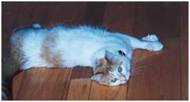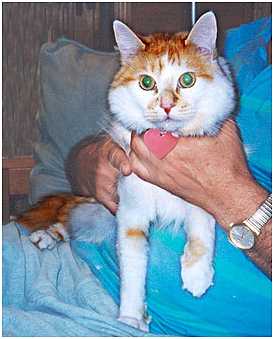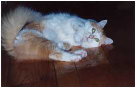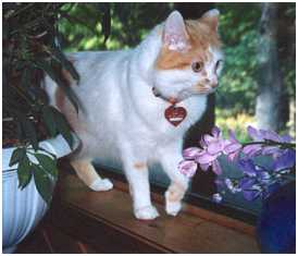 5 Sex: male Weight: 12 lbs. Residence: Lords Valley, Pennsylvania Origins: adopted at age three months from a shelter in New Jersey Significance of name: He was named Cuddles at the shelter because he was so affectionate. His nickname is The Prince. IQ: 115. He's smart enough to run away from a bear. Temperament/personality: very sweet; he loves attention Quirky behavior: He will ONLY drink running water-- and only from a bathroom faucet (never from the kitchen tap). If we put water in a dish on the floor he looks at us as though we're crazy. He gives us the "I'm thirsty" look, meows, then turns and heads toward the nearest bathroom (we have four but he's not partial to any particular one). He waits for us to open the door, then jumps onto the sink counter. This behavior was the same when we occasionally commuted to Brooklyn -- there was just one bathroom and he still didn't use the kitchen sink or drink from a dish. I think he'd rather die of thirst than drink from a bowl. I don't know what he does when we're away. Favorite people food: He has no interest in human food whatsoever. Favorite game: I put him in a basket and swing it back and forth by the handle. The wider the arc, the better he seems to like it. Yet more quirky behavior: He's a great traveler and doesn't mind being in a carrier -- and for long periods of time. It was once necessary to keep him in the carrier in the car for eight hours and he was perfectly fine. Interactions with other animals: He'll hide under the bed if a large dog comes into the house. But when he encountered a deer in the yard (sometimes he manages to get out even though we try to prevent it), he stood his ground. And it was quite large in comparison to Cuddles. They were nose to nose and you could see Cuddles was thinking "I live here -- scram." Eventually the deer took off. Observations: He sleeps in our bed and doesn't bother me until he sees that my eyes are open. He doesn't chew anything he's not supposed to. He's a great mouser and was so even at three months old. He's intuitively graceful -- he walks along shelves crowded with stuff and never knocks anything down. Comment: Our last cat, Bigfoot, was a "trumbanik." Cuddles is a little treasure. |